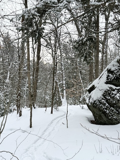 I’ve waited a week and am glad I did. Temps have risen into the 20s already this morning. No wind. Clouds instead of sun but that’s okay. I step out of my car, parked at the bottom of the woods road, to assess the snow conditions. Should I use snowshoes or microspikes? There’s only 3-4 inches of snow on the ground, but there will be more by the time I leave the road and enter the woods. I strap on my snowshoes.