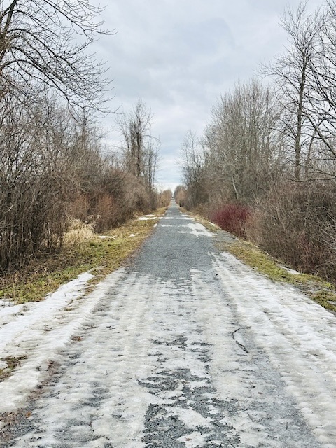 During the past few days, afternoon temps have spiked into the 40s. That has caused a major melt-off, which excites a guy like me who likes to tramp in cold mud. The trails in the woods are still snow packed, and mountains, well, forget about the mountains. It’s still deep winter there. But here in the Champlain Valley, the rail trails are opening up. So I did a couple hikes on the local one.
